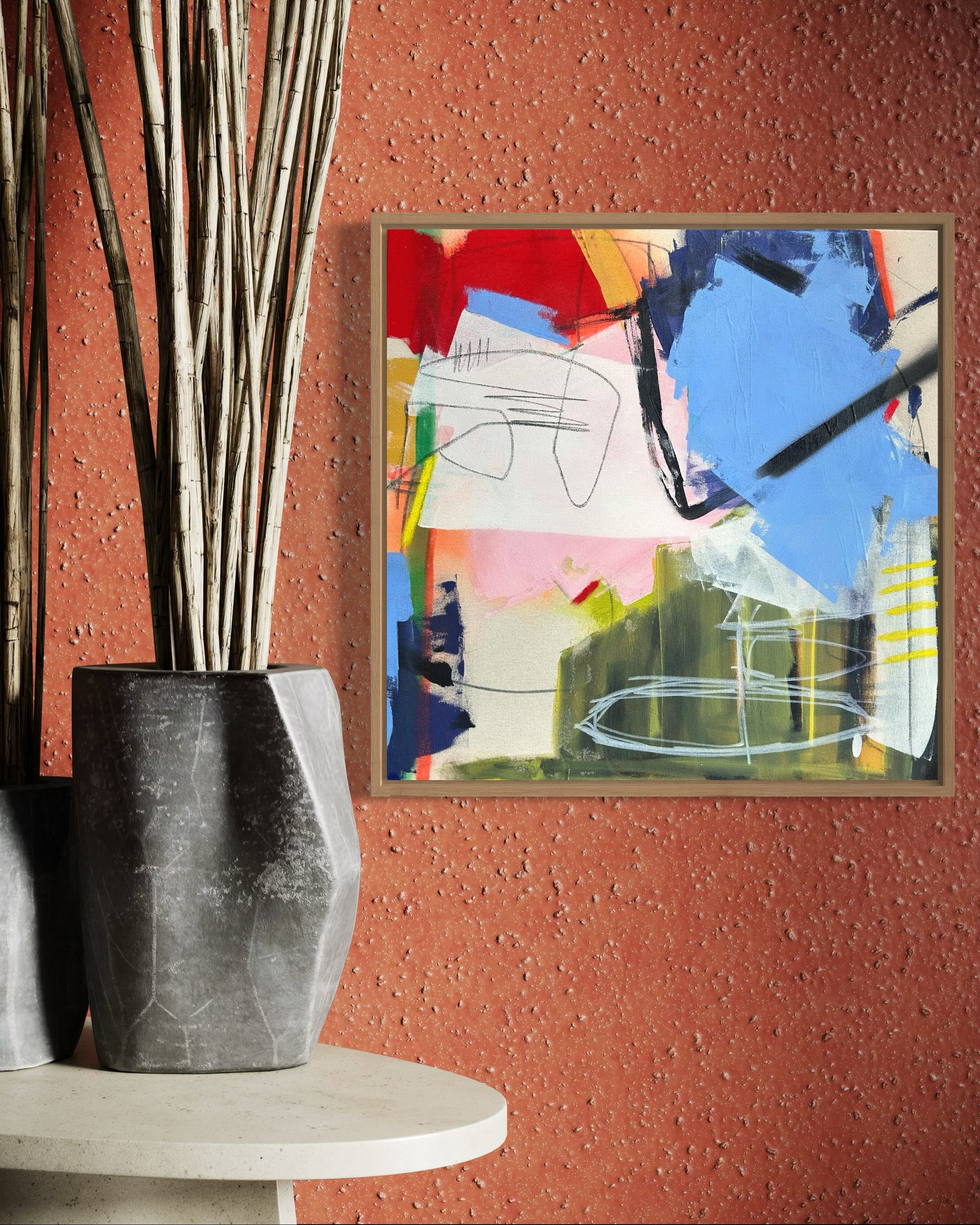 A lively dance of color and line, Four Season captures shifting moods — crisp blues, warm reds, earthy greens — like nature moving through spring, summer, fall, and winter. Dumas layers bold brushstrokes and playful scribbles, inviting you to wander through the rhythms of change.
